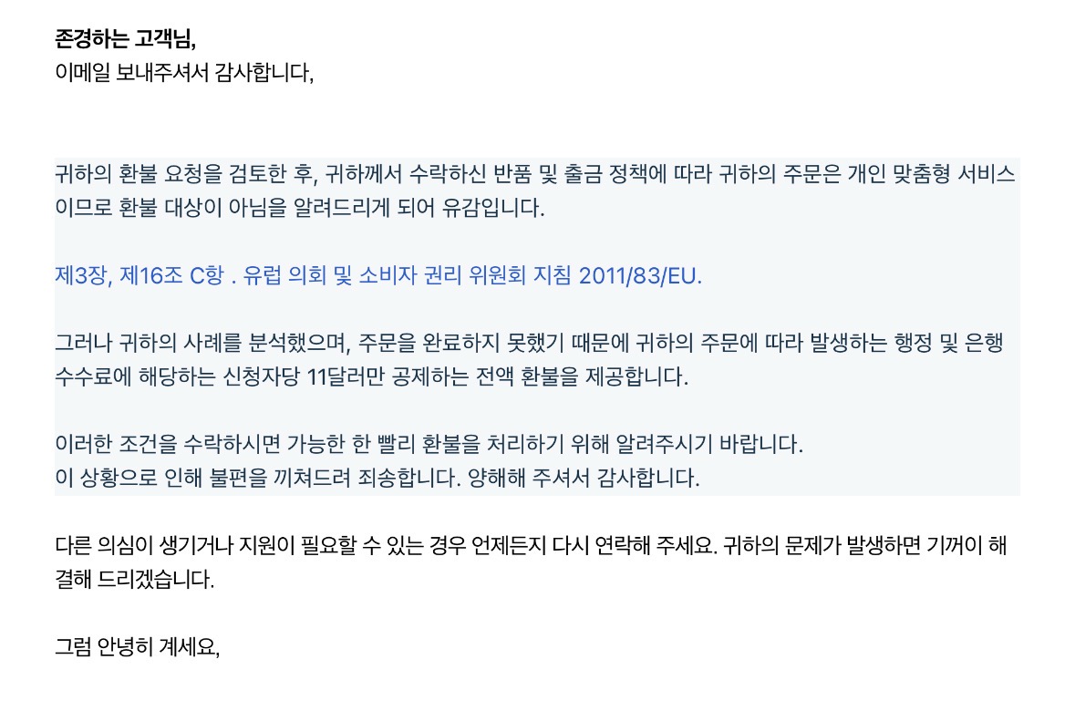고로!!! 결제가 된 그 순간에 모든 절차를 STOP! 하고 바로 메일을 보내 환불 의사를 표현해야 한다. 나는 그 당시 제발 사기만 아니어라 사기만 아니어라 빌며 보냈기 때문에 수수료를 제외한 금액을 환불해주겠다는 메일을 받고 더이상 별다른 조치를 취하지 않았다.